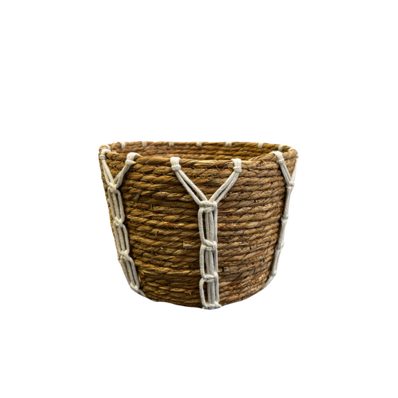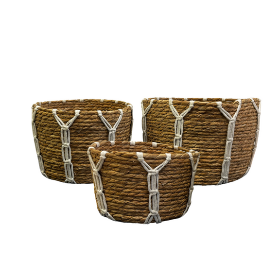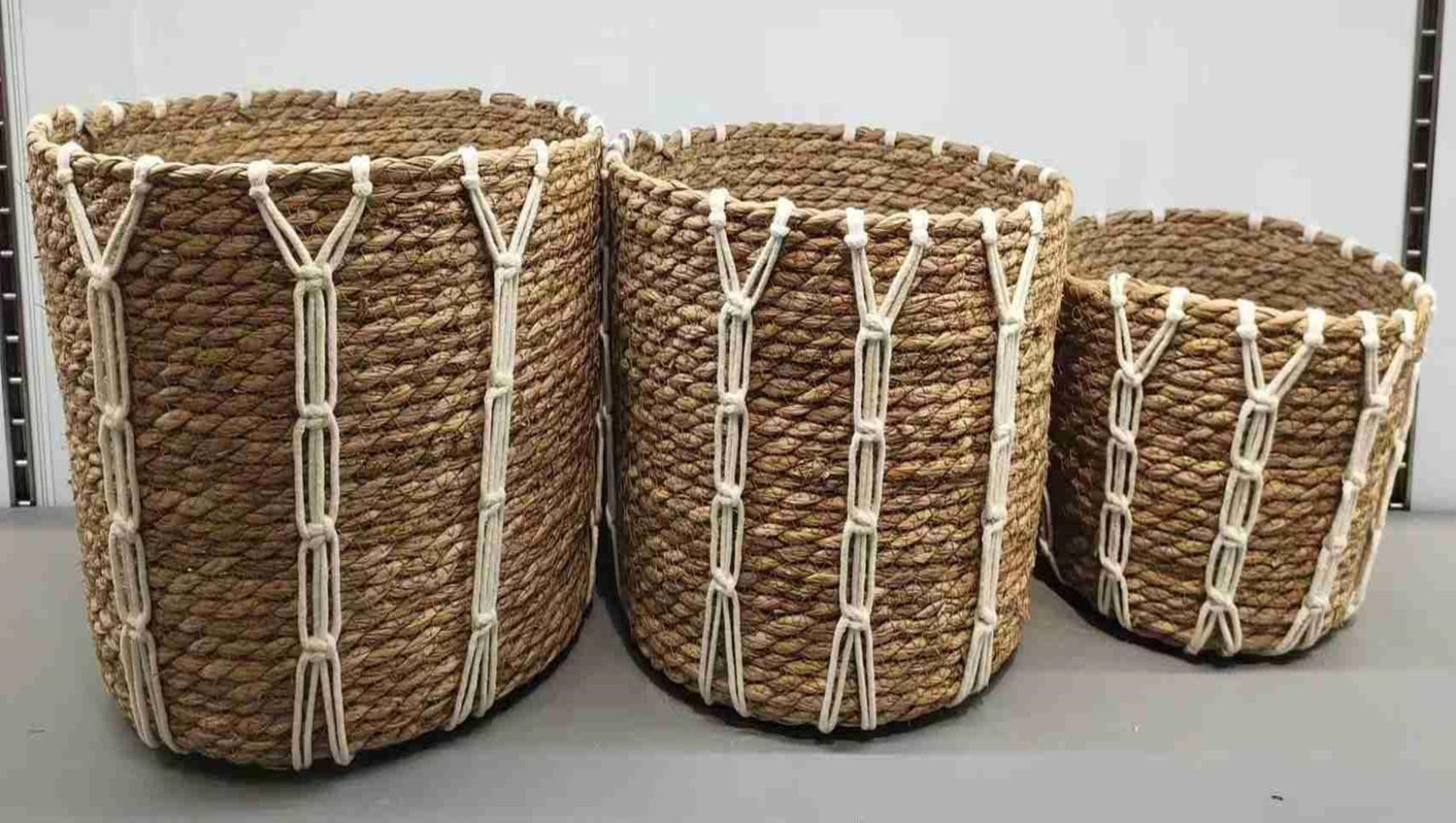 Diese stilvollen und vielseitigen Körbe bestehen aus geflochtenem Seegras und sind mit dekorativen Makramee-Akzenten verziert. Sie sind ideal zur Aufbewahrung von Gegenständen oder als dekorative Übertopfe für Pflanzen.