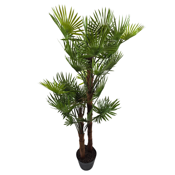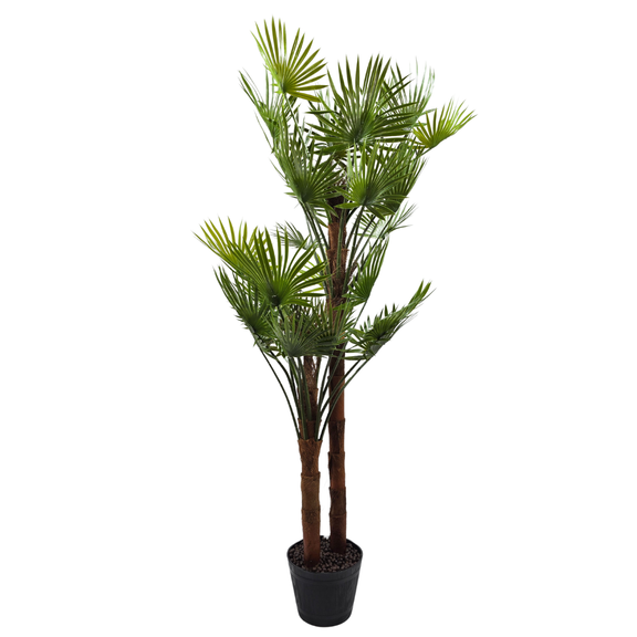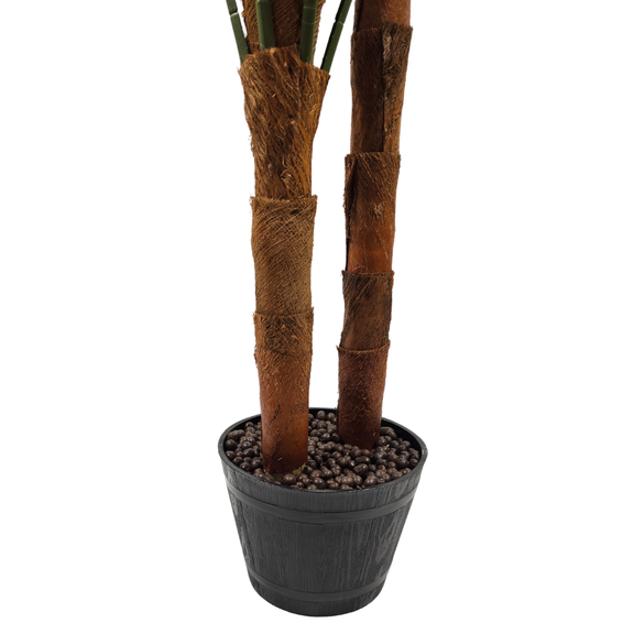 Diese prachtvolle Kunstpalme bringt das Gefühl eines tropischen Gartens direkt in dein Zuhause. Mit ihren filigranen Fächerblättern, den naturgetreu gestalteten braunen Stämmen und dem hochwertigen, holzähnlichen Topf ist sie ein stilvoller Blickfang in jedem Raum.